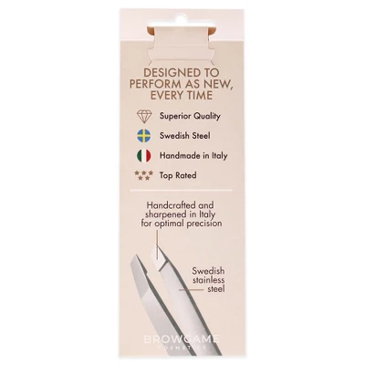 Browgame Original Slanted Tweezer is a perfectly angled quality tweezer that allows precise, comfortable and easy plucking. Handcrafted in Italy, the fine tip will easily grasp even the smallest, shortest hair by the root without breakage or pinching. This tweezer is a must-have, essential tool for your make-up bag!