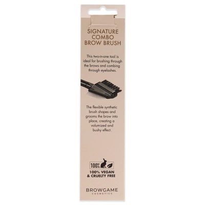 Browgame Signature Combo Brow Brush is a two-in-one tool that is ideal for brushing through the brows and combing through eyelashes. The flexible synthetic brush shapes the brow into place, creating a volumized and bushy effect. It’s also useful for blending in previously applied brow colors. The solid steel comb separates lashes and removes clumps and mascara excess.