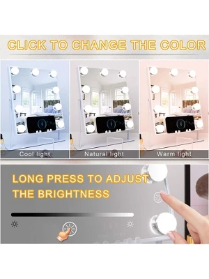 The Smart Hollywood Mirror with Lights is the perfect addition to your makeup routine. This multifunctional mirror features a Bluetooth speaker and wireless charger, so you can charge your phone and listen to music or podcasts while getting ready. The 3 color dimmable lights allow you to customize your lighting to your preference, and the smart touch control makes it easy to adjust the brightness and temperature. With a sleek and modern design, this mirror will fit perfectly in any space. Upgrade your vanity with this smart mirror that offers both practical and entertainment features in one.