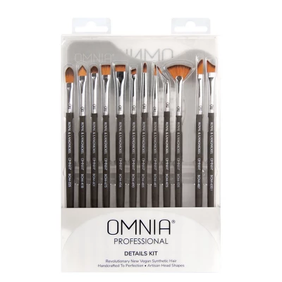 This superior Omnia Professional Details 12p Set selection of brushes specializes in precision and detail. These OMNIA® Pro brushes were selected by experts as the ultimate necessities for detailed creations. The included mixing palette is perfect for blending the perfect shade.Each brush uses 100% Omnilux™ filaments: a revolutionary new vegan synthetic hair produced using patented nanotechnology, where each hair filament is manipulated at the molecular level to be superior to natural hair. Omnilux™ filaments are super-soft in feel and engineered with superior tips to provide the ultimate application with every stroke. Every brush is handcrafted to perfection.This Set Includes: BOM-225: Detail Concealer, BOM-418: Pointed Cream Shadow, BOM-601: Lip, BOM-675: Flat Lip, BOM-456: Flat Eyeliner, BOM-490: Angle Liner, BOM-485: Pointed Liner, BOM-481: Detail Liner, BOM525: Lash Fan, BOM-487: Liquid Liner, BOM-650: Contoured Lip, and the Omnia Brush Makeup Palette.