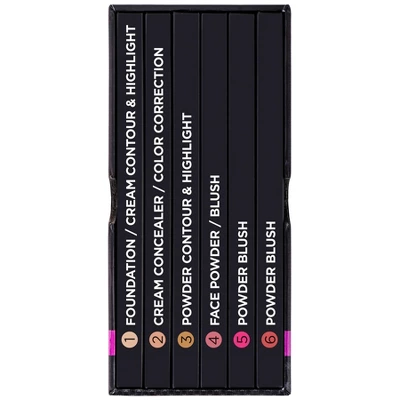- One layer of matte contour and highlighting powder foundations (warm and cool toned) . One layer of 12 mini cream concealer and contouring shades, two color correctors, and a highlight